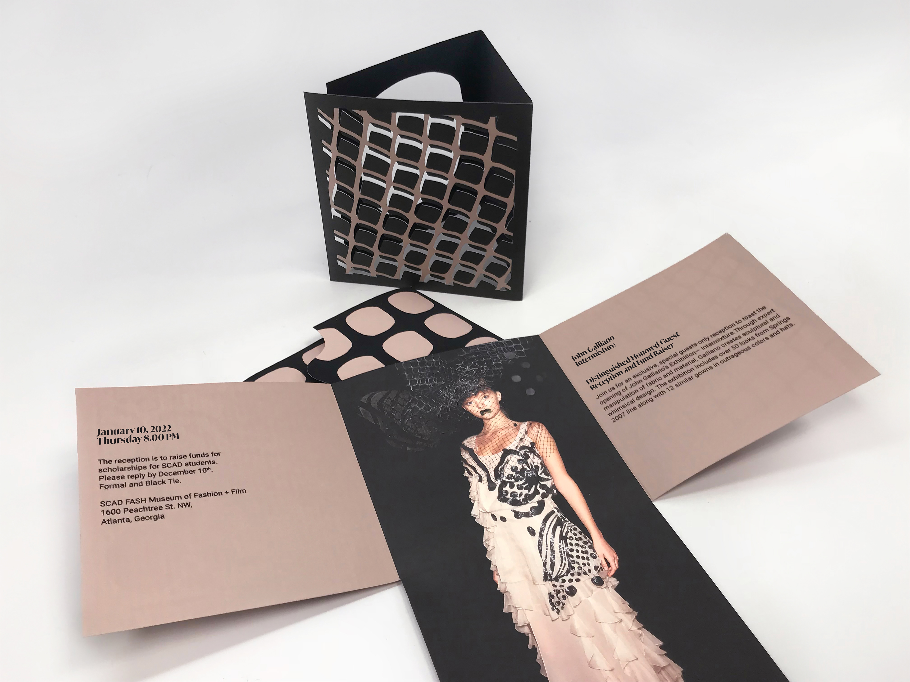 The purpose of this project was to hand produce a high-class and exclusive SCAD FASH invitation. The invitation shows a hand picked dress from the John Galliano Unseen line to request guests to see more. A final envelope encloses an RSVP card with a return address to preserve space for the guest. I illustrated the panels of the card to display the incredible texture of the dress before its reveal. The feeling of the card needed to feel as textured, alive, and over the top, as it did when the models walked the runway.